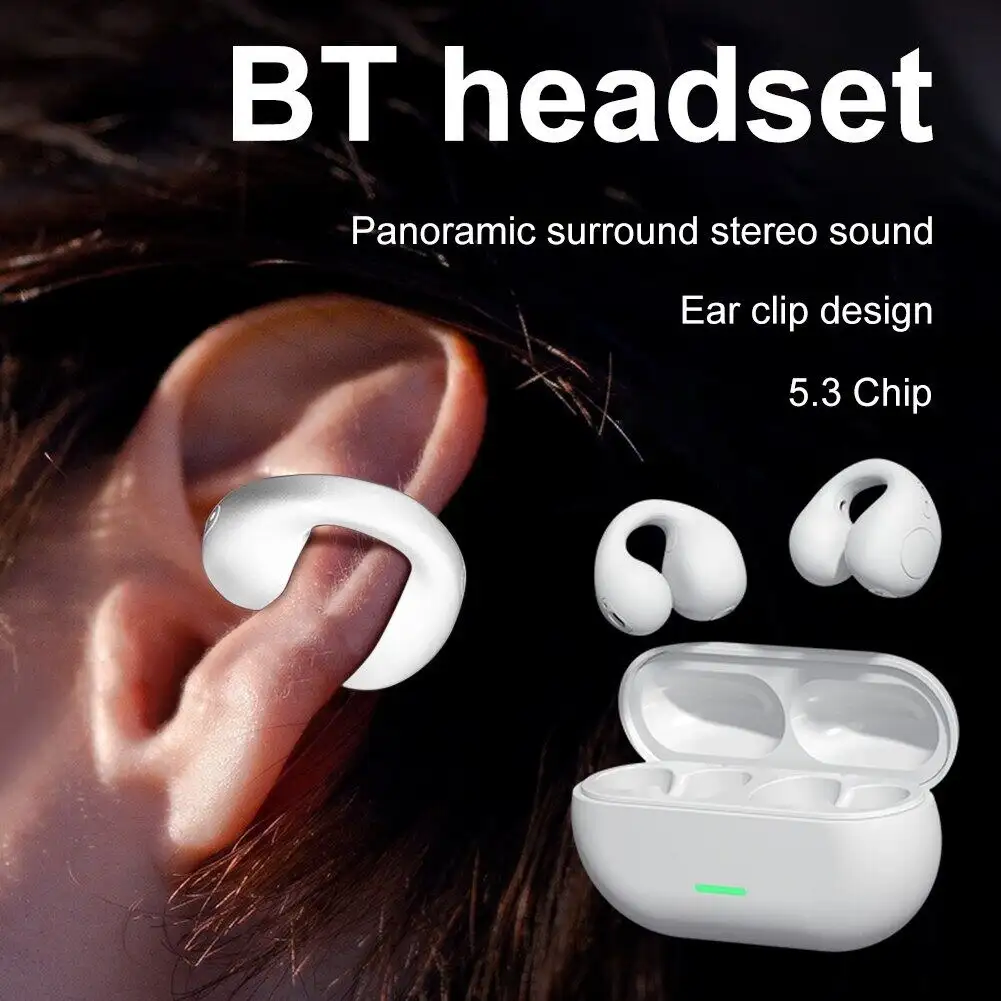 Bone Conduction Earphone with Mic Bluetooth-compatible Headset 300h Standby Time Stereo Bass for Running Cycling Hiking Driving Features: 1. Unique Design: Excellent ear clip design of bone conduction earphone reduces pressure on the ear canal, achieving optimal fit and comfort. 2. Application: The mini comfortable design earplugs firmly fit all shapes of ears, making them 100% safe and stable for running, cycling, training, jogging, hiking, gym workouts, and more. 3. Stereo Bass: Bluetooth-compatible headset has 3D immersive three-dimensional surround sound, high bass balance, strong signal, and smooth connection when talking and listening to music. 4. Stable: High sensitivity microphone of ear-Clip bluetooth-compatible 5.3 headphones ensures that your voice is always loud and clear during calls. 5. Automatically Connected: Remove 2 headphones from the charging box and they will automatically connect to each other. Then simply enter the phone's Bluetooth-compatible settings and select the model to pair the earplugs in one step.